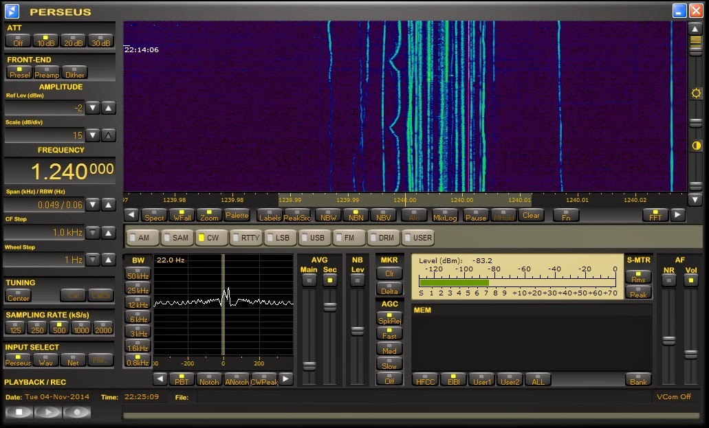 It's always interesting to use one of the many 'audio viewing' software programs, such as 'Argo', 'Spectran' or Spectrum Lab, driven with receiver audio, to dig deep into a section of the spectrum using very narrow bandwidths. The narrower the bandwidth becomes, the greater the signal-to-noise ratio, increasing sensitivity in effect. The use of digital signal processing software can create the extremely narrow milliHertz filtering needed to view signals buried deep in the noise...the deeper the search (20db, 30db or more into the noise), the longer the time needed to build up the visual display of signals that would be far too weak to detect aurally.Recently, rather than using Argo to view a slice of spectrum I set up the Perseus waterfall display to have a deep-look at 1240kHz. This is one of the broadcast-band's 'local' channels and one that BCB DXers refer to as a 'graveyard channel'. Almost all stations on the various graveyard frequencies run a maximum of 1kW day and night. According to the Medium Wave List, there are presently 166 stations in North America operating on 1240kHz...one of the reasons that 'DXing the graveyards' is so interesting.
