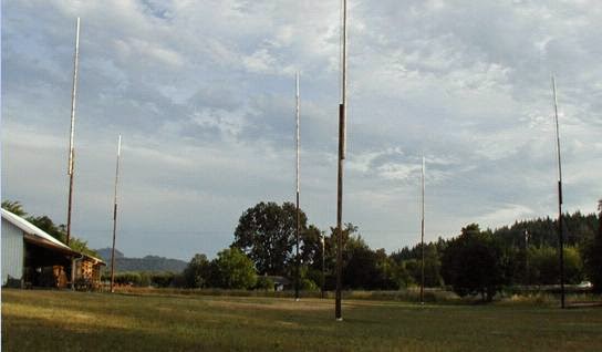 Rudy, N6LF ("XSH/20"), runs around 20Weirp to a large top-loaded vertical. The center (radiator) pole is almost 100' high while the top-loading support poles are 80'. Full details of Rudy's fine system, along with much more about 630m, may be found at the Antennas By N6LF website.