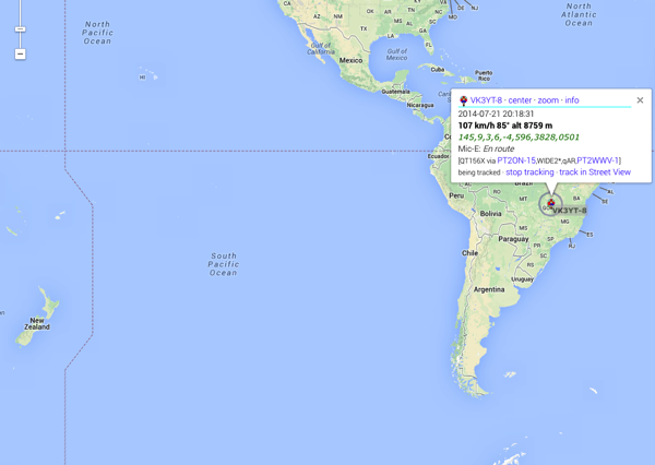 The small balloon travelled across the South Pacific and reached the coast of South America in less than a week! From what I can determine, it was last heard from on July 21st....29,000' above central Brazil and heading for the Atlantic Ocean at 69MPH where, I presume, balloon #8 met its demise.