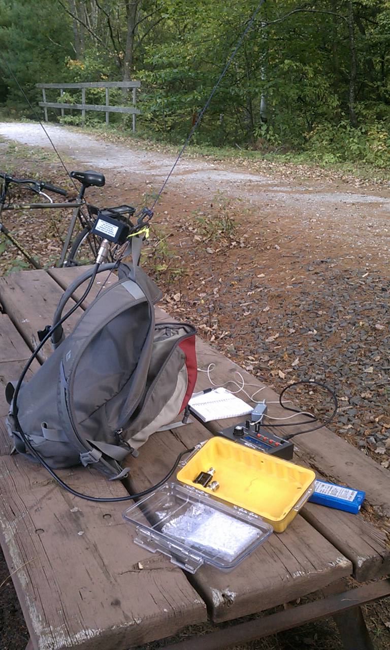 It was a short afternoon ride… maybe three miles. On a whim I stopped by a small bridge and set up some gear. I stayed on 20 meters with a half wave wire and 4 watts from the HB-1B. Right off I heard Alex, R2UZ in Russia calling CQ. He answered and gave me a 559. Up the band a bit, Jan OK1RO in the Czech Republic gave me a 569. A few minutes later, I came across Dave, G0GKH. He gave me a 569, but said there was lots of QSB on my signal. Non-the-less, he copied all of my information. He was running 100 watts to a G5RV.