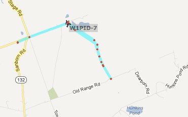 I brought my Kenwood TH-D72 APRS handie with me. Here’s an image of my track captured from http://aprs.fi – I continued down the Old Range Road to the east another quarter of a mile, but I couldn’t hit an APRS digipeater from there so it doesn’t show in the image below.
