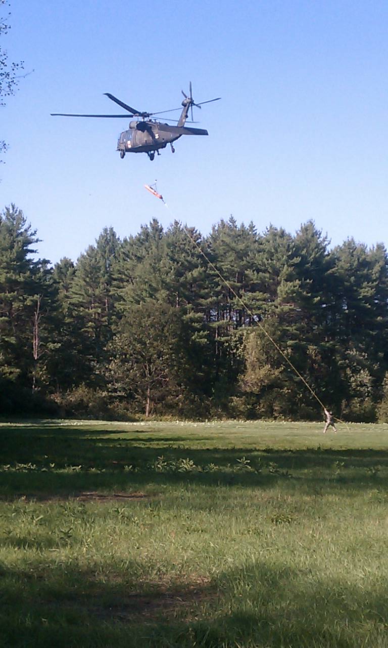 I walked over to see what was going on. “You want me out of here?” I asked the airman. “No, you’re fine,” he replied. He explained that the helicopter was going to circle the area, drop a rescue litter and then circle again and haul the litter aboard. They were practicing rescue operations. The airman is a medic, and his team is leaving for Afghanistan at the end of the month. I thanked him, wished him godspeed in Afghanistan, and walked off the field to watch the practice session.