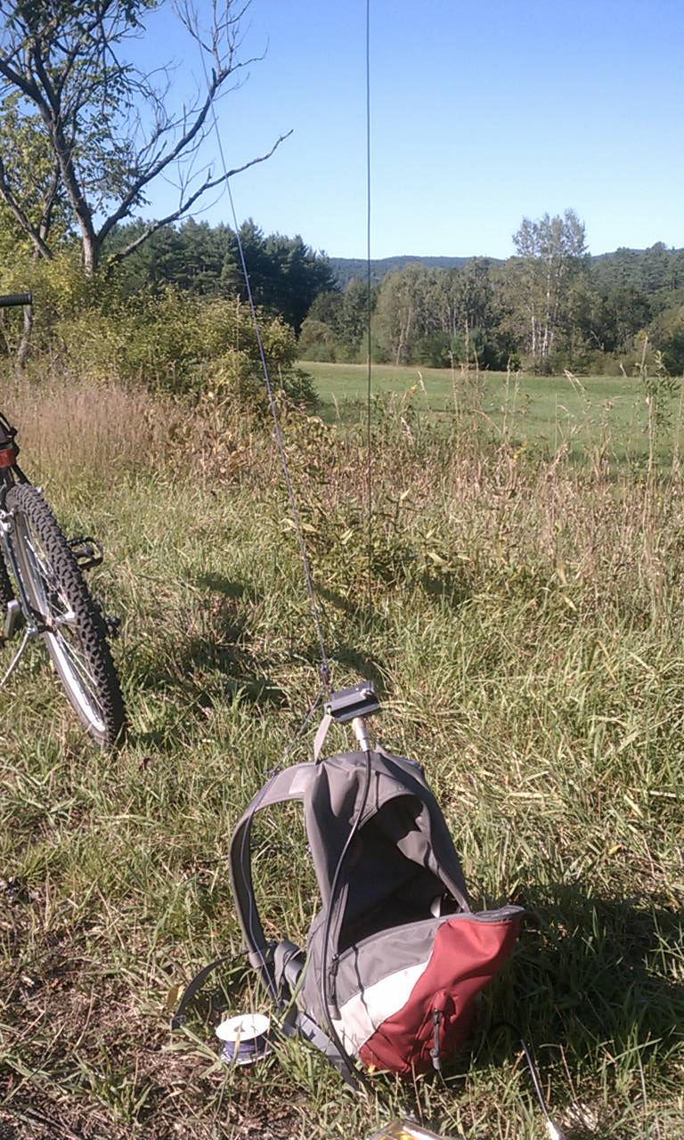 I set up on 20 meters under a large white birch tree. This photo shows the view from my operating position. I was using the HB-1B at 4W with a half wave wire over a tree branch.