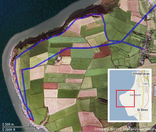 Cumbria is famous as the county of the English Lake District but it has more to offer than mountain walks. I don’t agree with Alfred Wainwright who said he could not see the point of walking round a mountain when you could climb to the top of it. There are many beautiful walks in the valleys and round the lakes which my wife (and my knees) much prefer over climbing and descending even if they don’t offer much scope for making radio contacts. Less well known, but just as spectacular, are parts of the coastline. One of our favourite outings is to park in the village of Sandwith and go for a walk along the cliffs. This is where we went last Sunday.