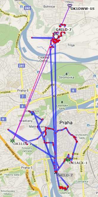 APRS works well in Prague because there is a network of several digipeaters and gateways within a radius of a few kilometres of the centre. The apartment where we were staying was just a few hundred metres from the QTH of OK1ALX who runs a digipeater and Igate, so most of the APRS signals I heard on my VX-8GR inside the apartment with the stock rubber duck were S9+.