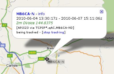 I have noticed a bit more APRS activity round here in the last few weeks. Today I noticed another new station mobiling around the north-east of the county – G7NZR. The info for this station showed that he was actually using DPRS, the digital version of APRS, and was being gatewayed through MB6CA. This is a D-Star simplex node set up by G7NZR. Its coverage map shows that MB6CA can’t be heard in Cockermouth or Workington, so for the time being at least West Cumbria is still a D-Star free zone.