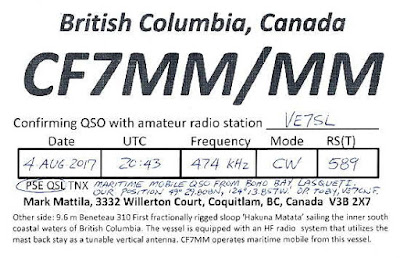 All-in-all, I think the 630m operation was a great success and very likely the first-ever 630m marine mobile operation on that band, as I don't recall this happening anywhere else over the years. It was also a great way to pay homage to the band's original maritime heritage where its quality groundwave and skywave capabilities were used to advantage for so many decades safeguarding mariners worldwide.