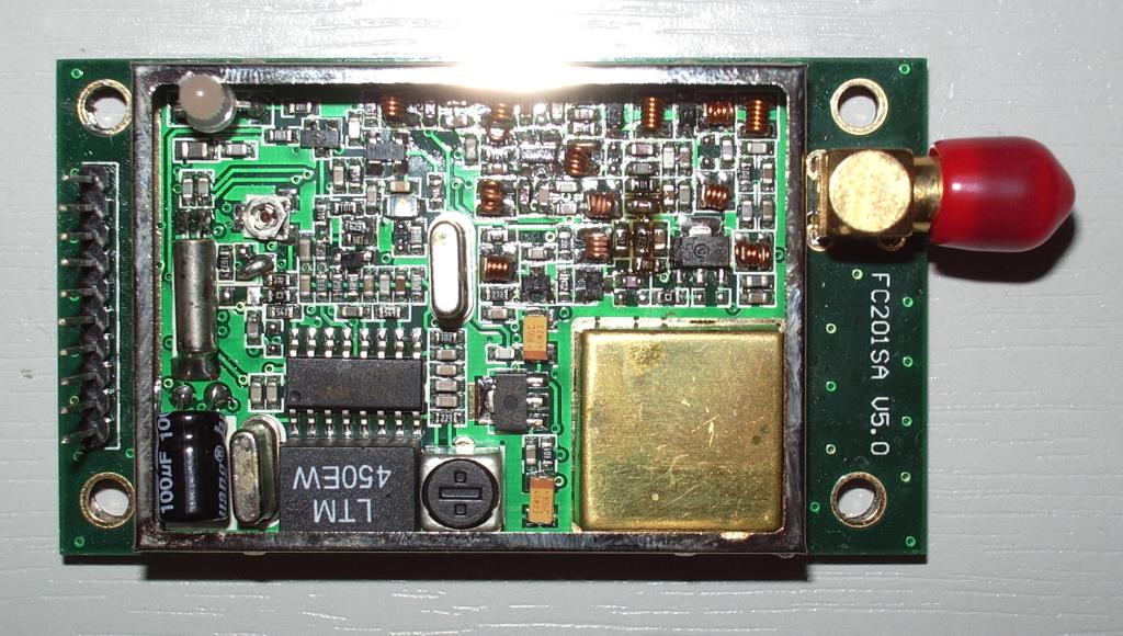 What I received was just what you see in the picture (less the PL259-BNC adapter which was included in the picture for scale). No documentation, no indication as to what the connections to the 10-pin connector are, nothing. It is completely unusable as sent. What’s more, the Elcom Research website I originally ordered it from now seems to be defunct. The only identification is the part number FC201SA on the circuit board. I typed that into Google and found that the module is an FC-201/SA Audio/Data RF Module manufactured by Friendcom in China. Google also turned up a PDF user manual on the Friendcom site, so I was able to download and print off that.