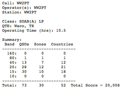 Things started out rough Saturday morning (UTC) on 40m. Worked TO7M on my first call then spent a frustrating hour or so with no contacts. After a break things started to improve a little. Stayed at the mic until around 0600 UTC (2 am local) and landed 12 countries/7 zones on 40m, plus Canada (zone 3) on 80m. Worked 20m and 15m for about an hour and a half in the morning before going out and about, and again early Saturday evening (UTC Sunday) for about a half hour. Worked 13 countries/9 zones on 20m, and 3 countries/3 zones on 15m. Sunday saw fairly good conditions on 15m (14 countries/7 zones) and 20m (9 countries/7 zones).