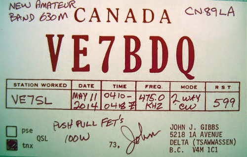 In early May, VE7BDQ (John) was my first contact on our new 630m amateur band! Soon after, I had QSO #2, with VA7JX (Jack), on Vancouver Island. So far there appears to be only one other station in Canada on the band... VO1NA in Newfoundland!