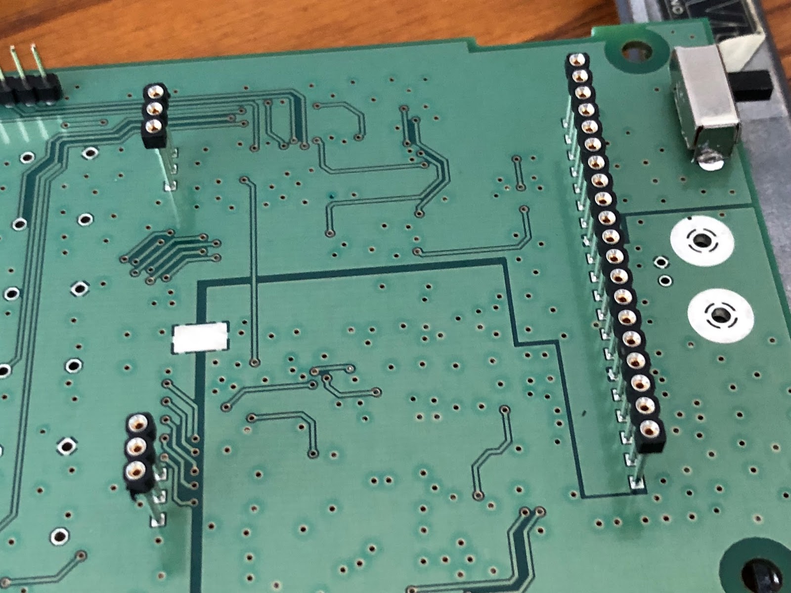 The instructions had me installing the ON/OFF slider switch first and this was a great start for this old rusty kit builder. I then moved onto the 3 rails in which the LCD would eventually plug into. You will notice from the picture these are raised up on the board. Each pin has a "collar" so the rail will be at the proper hight but the builder has to be cautious and make sure the rail is firmly seated and upright and straight. One rail is 20 pins and once it's in....it's in! In the past I have had to remove these types of components due to my own lack of attention. IT IS NOT FUN and I have a