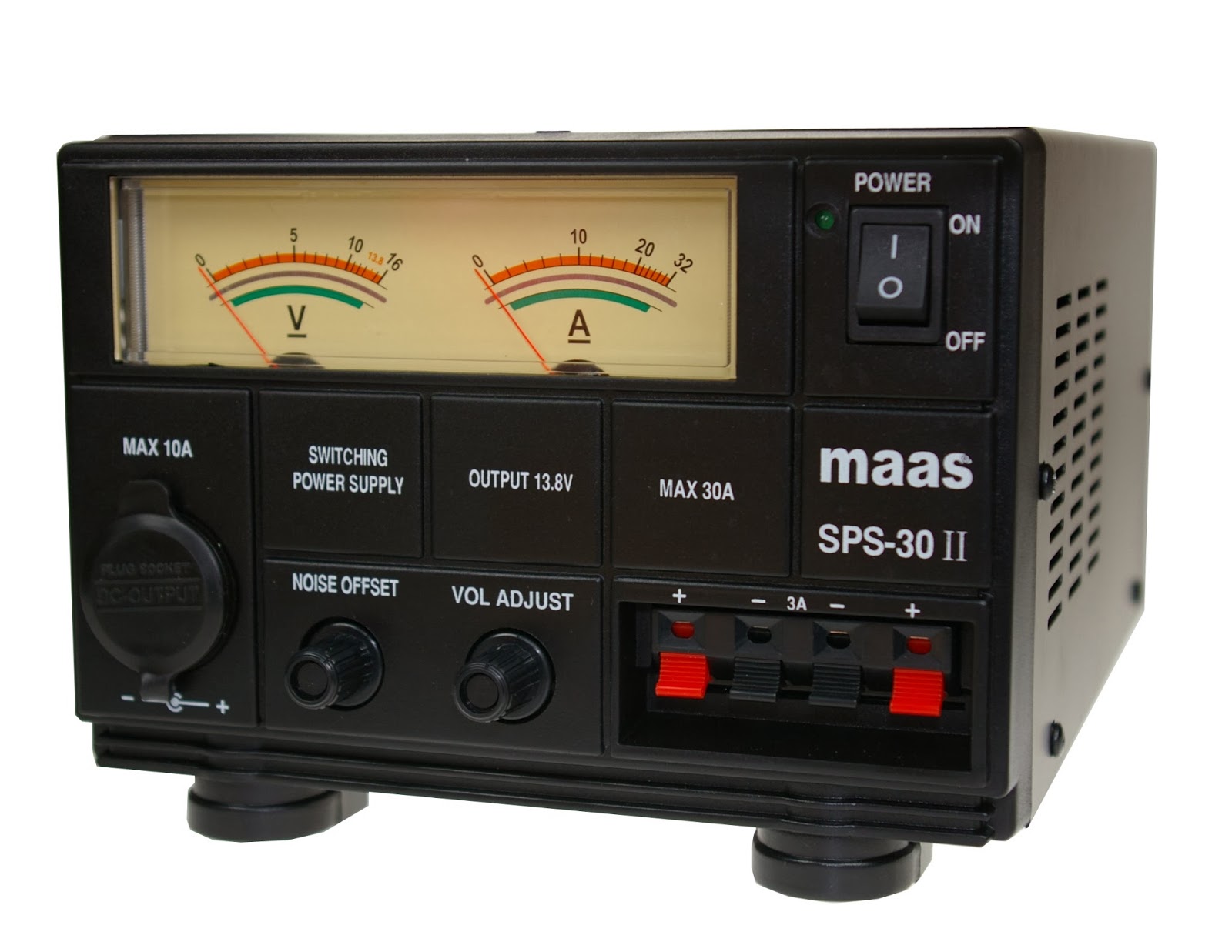 I have a decent 7A PSU, purchased last year which I am sure would have sufficed for 10W maximum operation however I decided to also purchase a MAAS SPS-30-II 30A(35A peak) PSU. It was a good price from Radiozing and offers plenty of power for anything I am likely to run in the foreseeable future, and from the pictures and reviews seems to be built like the proverbial brick out-house. As well as the main connectors on the back it has spring clip terminals on the front as well as a cigar lighter type connector. Dual meters showing V/A and can be used in variable mode from 9-15V or fixed at 13.8V
