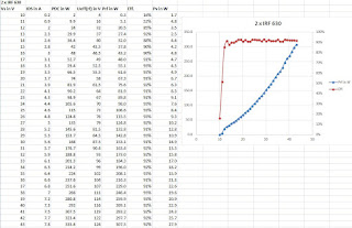 I have seen on your Website, that you are also a MF/LF fan and builder of GW3UEP QTX. I build the version with 2 IRF540 as you proposed and the same version with 2 IRF630. As I bought some time ago a PSU with can be regulated from 1V to 60V and max 10A (it is a Manson HCS 3404) I made some measurements on both version. Find attached an Excel with the measurements I made, if you are interested in.