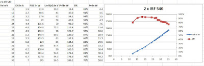 If you use the IRF540 version you can see that if the power exceeds 100 W, the efficiency goes down, as the IRF540 is only specified for 100V.
