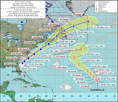 We have been hearing about it all week as Dorian hit the Bahamas and then the U.S. and now it's our turn here in the Maritimes. Julie and I have never been in a storm like this ever! It's 17:00 here local time and the winds are really picking up along with the rain but we are told on the new the worst is yet to come. I have no antennas as of yet up and thank goodness as now that I have seen what could happen here weather wise it may cause me to rethink where and how my HF antenna will be constructed and where. So far our power has not gone out but as the evening goes on the wind picks up I would not be surprised if we are in the dark. We did prepare earlier this week with water, food that can be cooked on the BBQ (once the storm calms down that is), our cells are charged up, our SUV is full of gas, the external battery chargers are topped up, our Eaton FRX5-BT radio if needed will be ready and the list goes on. Maybe because we are very new to this we are over reacting but I would rather have and not need than need and not have. Our generator arrived yesterday but before that can be put into service I have to install the transfer switch. We are now going to throw the dice and start dinner which is homemade mac and cheese.