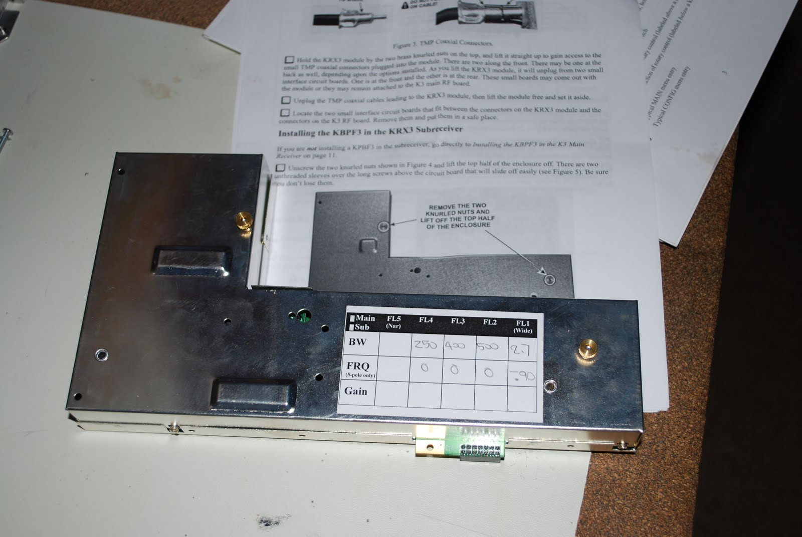 About 2 weeks ago I emailed my order into Elecraft for the KBPF3 general coverage board. It arrived on Thursday and was placed off to the side until Saturday. I did my reading to familiarize myself with the installation. It seems I was not familiar enough as I made an amateur mistake but more on that later. My K3 has the sub-receiver installed so I have the choice of putting the general coverage unit in the main or sub receiver. I choose the main receiver. So the first order of business is to get the work bench all cleared off and get the K3 on it. That is easier than it sounds as the back of the radio desk is a snake of wires and cables. Before taking ANY cabling comes off the K3 I made notes of where all the cabling came from and went too. In the past it was delusional of me to think I can just "remember" where all the cables went on the