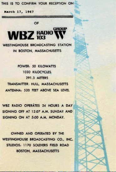 I vividly recall my excitement after catching WBZ-1030 in Boston, MA on my little 5 tube AC/DC radio and loose-coupled longwire. I had been hoping to catch an ID from them after listening for them for several Saturday nights! I even managed to get a QSL for my wall, similar to this one, shortly after the big event.