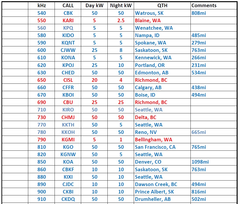 Using the same antenna, headphones and external wavetraps, proved once again the excellent performance available from a very small and simple hi-Q coil system ... a DX machine without huge coils and expensive Litz! A total of 51 stations were logged over a two-week period, one more than was heard with the CR-1 and with a few ‘almost’ heards still waiting for one of those really good propagation nights. Having the ability to adjust the coupling was very helpful and made some of the weaker stations a little easier to detect. Stations in RED are local strong signals while those in BLUE are skywave propagated DX signals: