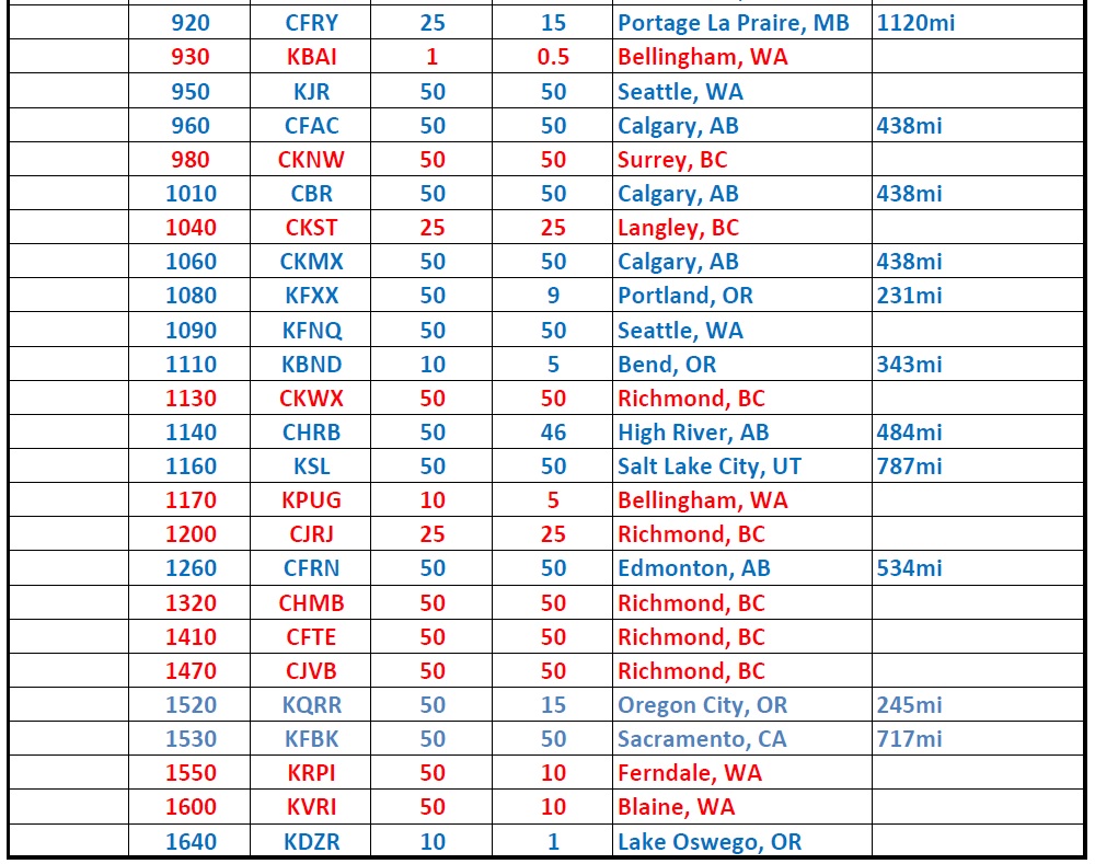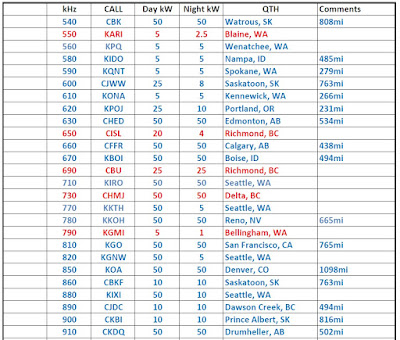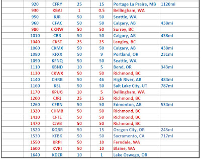 In just a few minutes of tuning through the band, it was very easy to hear and separate all 16 local stations (RED in the above log). A few hours after sunset (on a not-so-good night) yielded quick copy of KPOJ (620kHz) in Portland, Oregon (231 miles) as well as CHED (630kHz) in Edmonton, Alberta (534 miles), demonstrating that even this old 1940's I.F. can could be turned into a crystal radio DX machine!