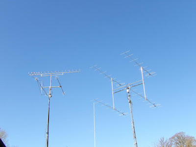 Conditions seemed unusually good and I was able to complete several contacts with my small station ... a single 9el m2 Yagi and an older 2m 140W brick amplifier. The Yagi is nestled atop my 50' tower's mast, between my triband Yagi, and Yagis for 6m and 70cm. The tower is located about 100' from the ocean and on these favorable moonrises, looks towards the moon directly over saltwater. The antenna appears to develop the full 'theoretical' 6db of seagain and performance seems fairly similar to what I would expect from a box of four similar Yagis.