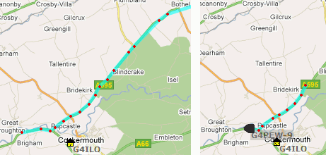 On the left of the screengrab you can see his track on Monday, when I was still using the Slim Jim. On the right you can see today’s track, received using the new antenna. It’s a lot shorter. I certainly heard a lot of packets after the last one shown by the grey blob, but none were strong enough to decode.