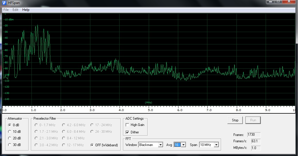 HFSpan is a stand-alone 0-40MHz spectrum analyzer, that comes with the Perseus software. Although I was aware of it, I have only used it sparingly. I next did some screen captures with all three antennas, one at a time, and sent them to Roelof.