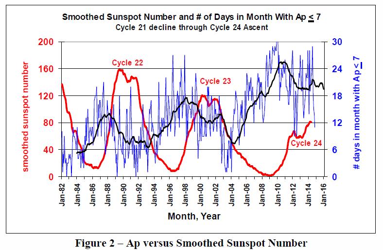 His graph shows the yearly trend of only the low Ap index days (geomagnetically quiet) versus smoothed sunspot numbers for several recent cycles. The blue line plots the trend of low Ap index values with the black line showing the smoothed values; the red line indicates the smoothed sunspot number (solar activity levels).