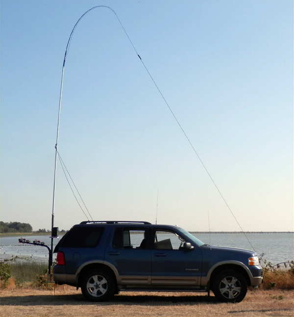 The antenna is about 24 ft high and the fishing-rod-and-wire top load is pulled forward about 8 ft. The matching circuit is a loading coil, variometer, and autotransformer. My Tx power was 20W TPO and estimated EIRP 75 mW. The rig was my home brew transverter with an IC-7410."