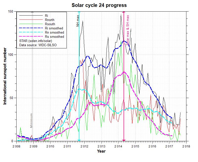With Solar Cycle 24 being one of the weakest on record, it has shown levels of activity on the way down that could rival the past few much stronger cycles in their waning years. Another oddity for this cycle was its 'double-peak', not unusual per se except that 24's second peak was the stronger of the two.