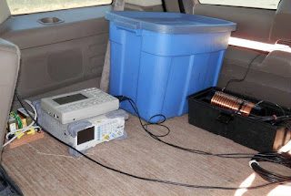 My transverter is actually the small box on the dash above the steering wheel. The gear in the back near the variometer is used only during setup to resonate the antenna. It's a signal generator and oscilloscope. The AC transformers are just an isolation transformer that I need to make the test equipment work with my 12V-to-AC inverter."