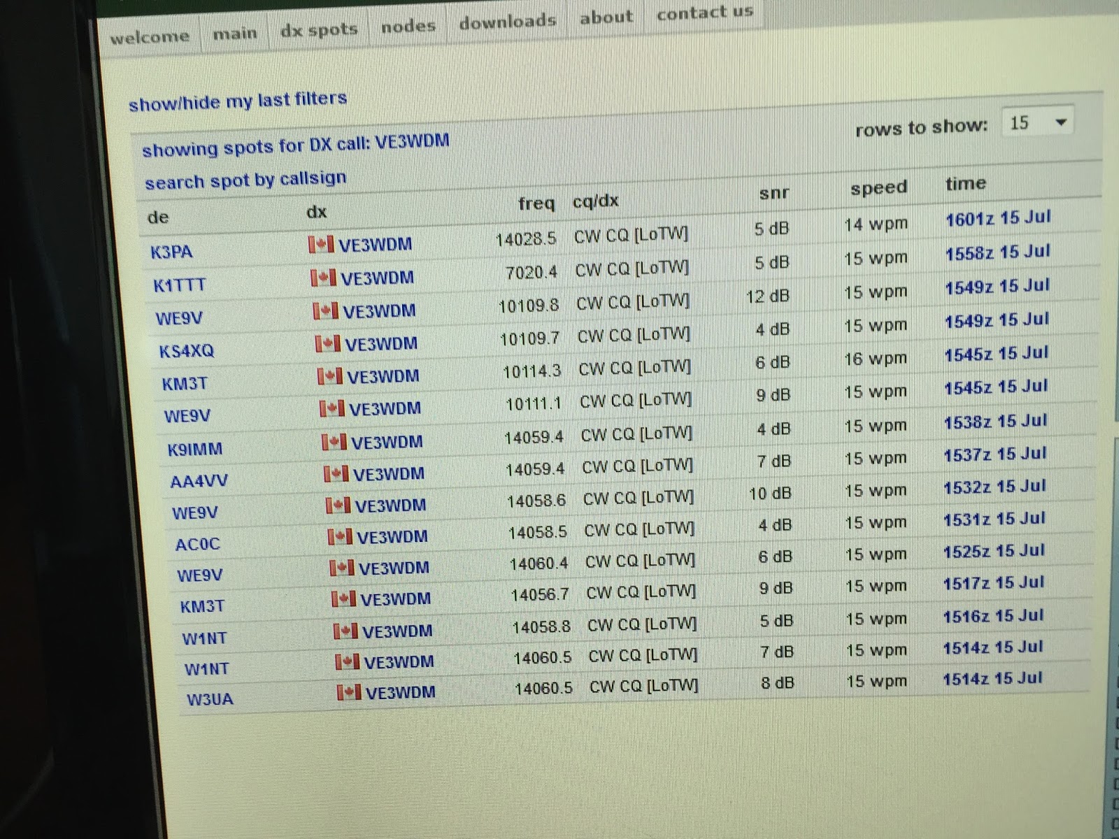 The first two antennas I compared were the rooftop vertical and the sloping dipole. They were both resonant on 20 meters and I used that bands WSPR frequency to compare. After comparing for two weeks I found only a minimal difference: they were equally good/bad. I did get consistent beacons from VY0ERC, though (probably the most northerly located amateur radio club in the world). But since there are only a limited number of WSPR stations on 20 meters I decided to switch to monitoring JT65 stations for the next comparison.