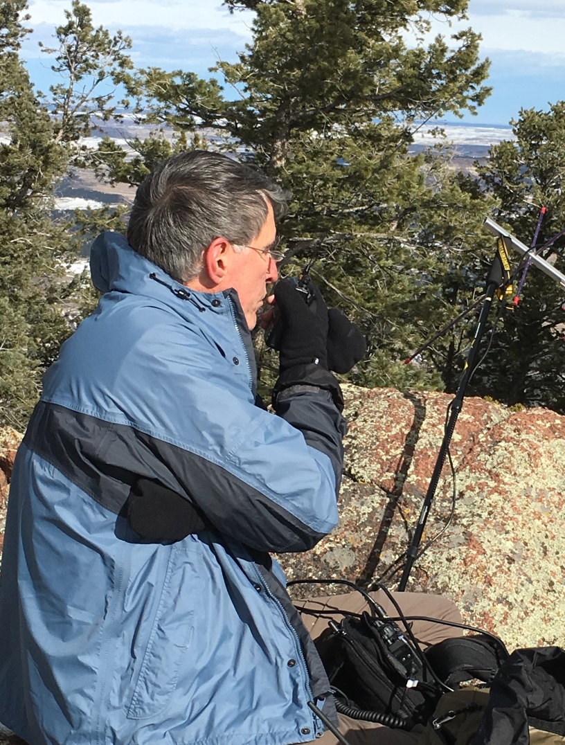 Joyce KØJJW and I hit the trail at 10:30 AM local with the goal of being at the summit around noon (1900 UTC) for the start of the ARRL contest. The trail was icy, but manageable with the gripping devices on our boots. The weather was chilly but not bad for January. At the summit, I configured my FT-60 handheld radio for 146.52 MHz using a 2m half-wave vertical. My first call netted a QSO with Tim, KAØMWA in Castle Rock. I worked a few other stations on 2m fm and then set up the 2m ssb station (FT-817 plus Arrow II antenna). On 144.200 MHz SSB, I contacted two Wyoming stations in grid DN71, about 140 miles away. I also gave a call on 446.0 MHz fm and worked W3DHJ and KE0HBW mobile.