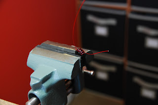 I just want to share some of the ideas I tried during my trial and error periods of toroid winding. Also the process I go through from start to finish. As with most any kit I have worked with you are given a recommended length of wire to cut and I have found at least with the Elecraft kits the total wire given is always more than enough to wind all the toroids. Now comes the fun part the winding, there was three methods I tried. The first was putting the toroid core in a vise and winding the wire through the core. I found this to be somewhat awkward for me, some may find it works for them but I was opening and