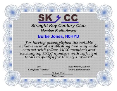 On the way to this achievement I was able to work enough unique call prefixes to earn the PFX award. The basic way this works is that each unique call sign prefix is equal in points to their SKCC number. For example my SKCC number is 8033, so my N0 prefix would be worth 8,033 points.