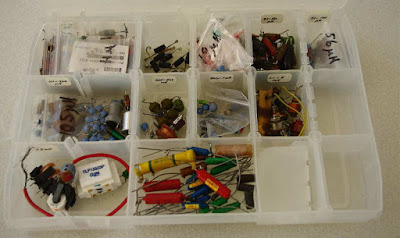 After a search of my RFC collection (see below), salvaged mostly from junked TVs, monitors, VCRs and other electronic cast-offs temporarily 'borrowed' for stripping from our local recycle center here on Mayne Island, I settled on a 1.2uH choke that I hoped would be a suitable replacement. It had just a few turns so I assumed it was wound on some sort of powdered iron or ferrite form. Whether or not it would behave at 144MHz was another question.