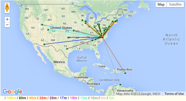 | Map of the last 100 reports from Reverse Beacon stations of my call sign Color coded by band |