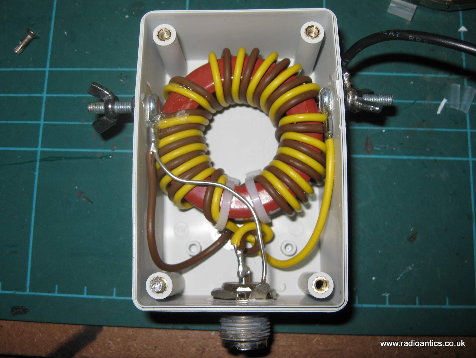 Given that nearly all other ham equipment I own is designed to be serviceable, including rigs worth several hundred pounds I found this annoying and unnecessary for a simple antenna, especially as the ethos is for amateurs to experiment and modify things. It certainly wasn't glued for weatherproofing as it would be have sealed all round, it could only have been to stop it being opened. I could understand this if it were protecting some patented, copyright design but it wasn't, behold the magic within the "special matching unit" nothing but a simple un-un which I suspected already.