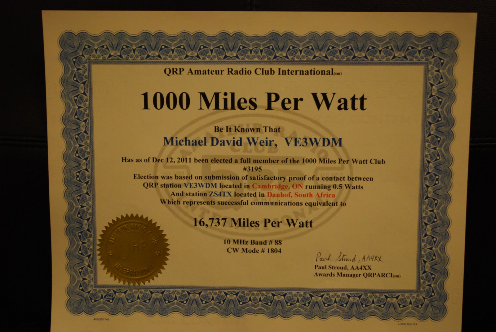 Over all I made 106 contacts out of that 84 contacts were made with 500mW's 21 with 5 watts and one contact on 40 meters with 50 watts. It seems that on 40m I just was not cutting it and to make a contact I had to raise the power to 50 watts. So that was the last contact on 40 meters. As for beating records I was thrilled to contact ZS4TX which got me 16737.20 miles per watt!!!!! Not only that in this contest I was able to make 30 contacts that topped my 8325 watt per mile record. Now running 500mW's did bring my QSO count down as there was lots of repeats I had to do. I just want to thank the op's out there who stuck with me and asked over and over again for my call instead of just moving on.