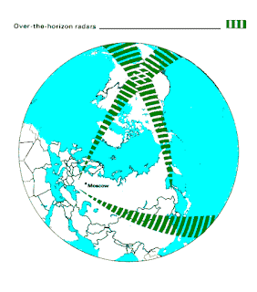 Initial speculation suggested this intrusive signal was some form of 'jammer' ... very common during the Cold War. It wasn't long before the true nature of Duga was thought more likely to be an 'over-the-horizon' (OTH) long-range radar system for detecting the launch of North American missiles aimed at the USSR. The three radar sites gave the Soviets good over-the-pole coverage as well as to the east, where it could also be utilized for tracking domestic rocket launches.