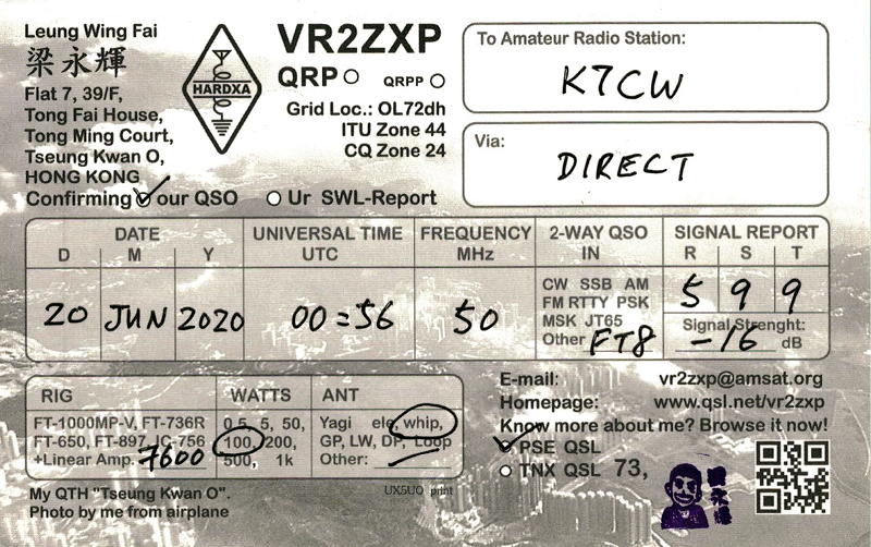 On June 20, at 0056Z, K7CW (Paul), south-west of Seattle, nudged his signal all the way to Hong Kong, more specifically, to VR2ZXP’s crowded apartment building. But that’s not the incredible part. That happened when Paul heard and exchanged signal reports with Alfred’s tiny station!