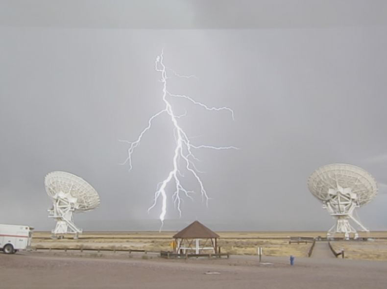 | A tendril of lightning betwixt two VLA dishes |
