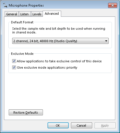 We begin by manipulating the input sound card port configuration as shown above. This will vary somewhat from sound card to sound card, but we want to be sure that we are capturing two channels and that the sampling rate is set at the maximum your card supports, which may take some experimentation and is not necessarily the highest sampling rate shown in the drop down.
