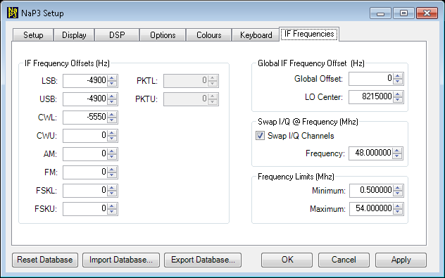 Here is the “fun” part, at least it was for me until I started banging my head on the desk. Be sure to set your “Global Offset” to 0 and select “Swap I/Q Channels”. The “IF Frequency Offsets” is where you will have to spend some time playing. The method I used was to tune to WWV in CW mode on the KX3 and determine the differential between the frequency displayed on the KX3 and the panadapter display. I then set the offset to compensate. To configure the offset for USB and LSB modes, I reduced the offset by the amount equal to my CW sidetone. This should get you pretty close, but may still require a little tweaking. Feel free to try my numbers, but I am unsure if they are valid from KX3 to KX3.