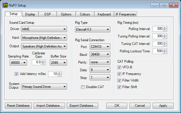 Here on the setup tab of the NaP3 configuration, we need to select the sound card input we are using and where we would like NaP3 to output decoded audio. Once again we have the option to manipulate the sampling rate, which as you can see is 48k for my sound card. In addition, we need to select “Elecraft K3” for the Rig Type and specify our CAT parameters. I began this adventure trying to use the “Elecraft KX3” Rig Type, but I found it to not work very well.