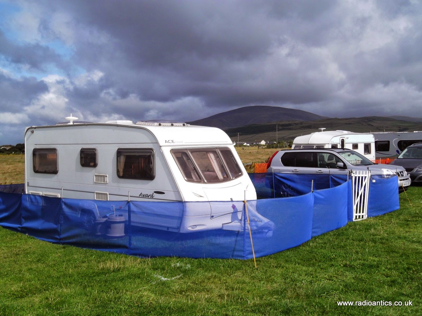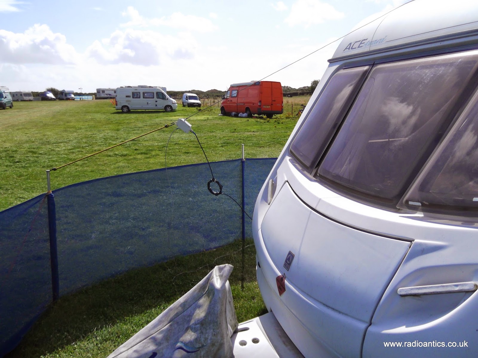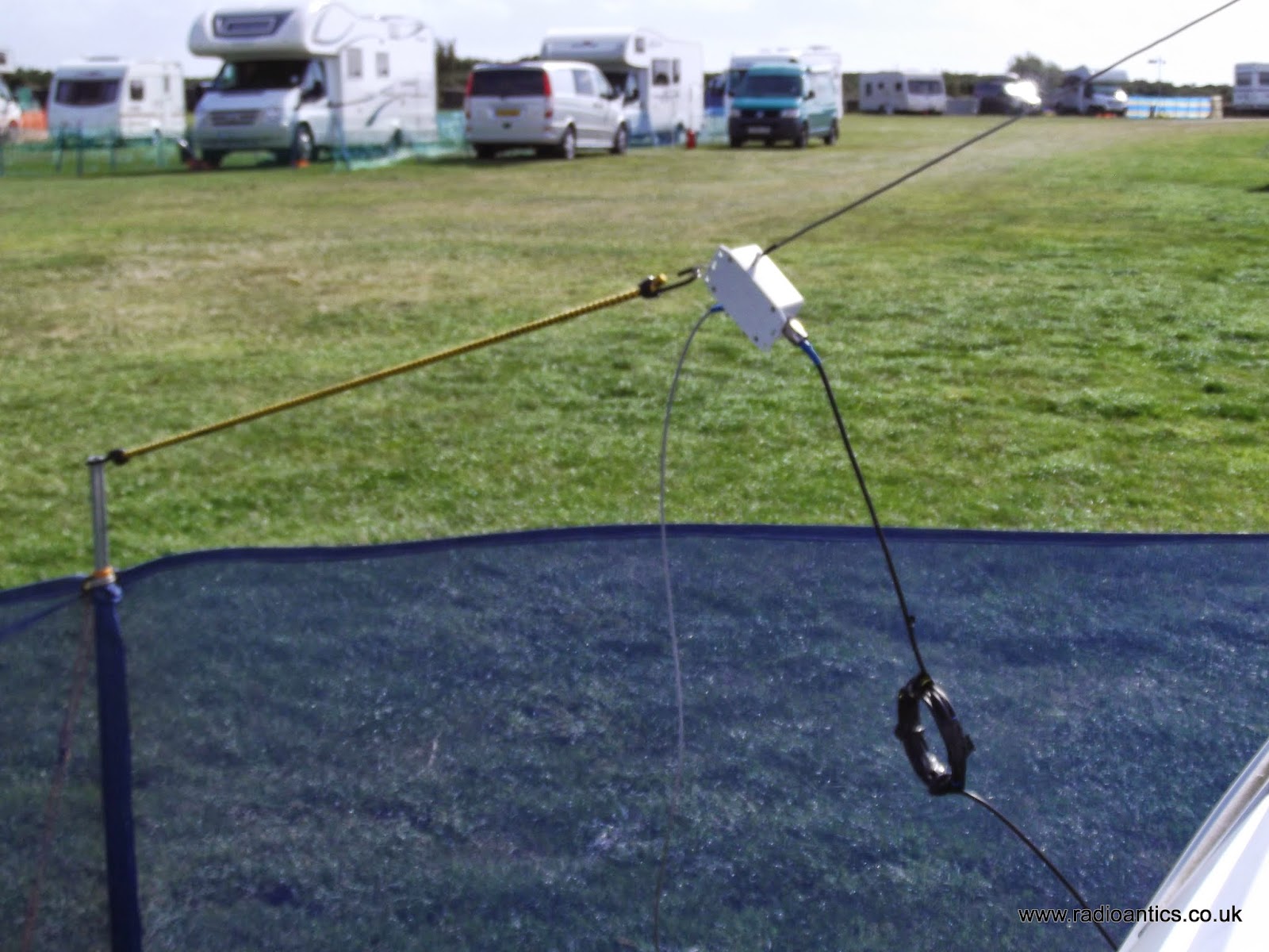 Despite losing over in a metre in length I tried again and managed to get everything up, the OCFD wires were tied out to form a sort of inverted-vee using a handy nearby fence, the Magintenna was pulled to form a sloper across over the front of the caravan, but due to the lost height actually touched the front of the roof. Amazingly I got an almost 1:1 VSWR on 40m and loud and clear RX.