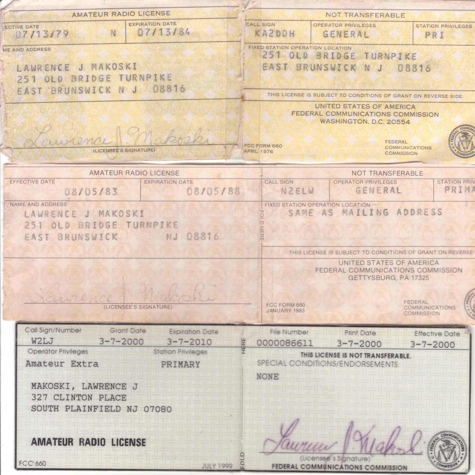 The top one is a KA2DOH one, and this is the license I received after upgrading to General in the Summer of 1979. The N2ELW one is from when I applied for a General Class call in 1983. Got this one in August of 1983 and shortly thereafter upgraded to Advanced on October 18th, 1983. The reason I remember that date so well is that’s the date of my parent’s Wedding Anniversary. If they were both alive, they’d be celebrating their 60th this year. Both of these licenses were from back in the days when the license term was only five years.