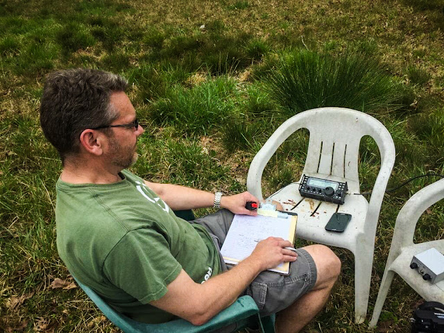 The Doublet's feed line has not been brought to the shack yet so I was just sitting under the antenna. The open feed line is running along the ground for a bit which certainly didn't help the signal but we haven't installed the posts to carry the feed line over to the shack and I was too lazy to move the chairs far enough away to keep the feed line in the air.