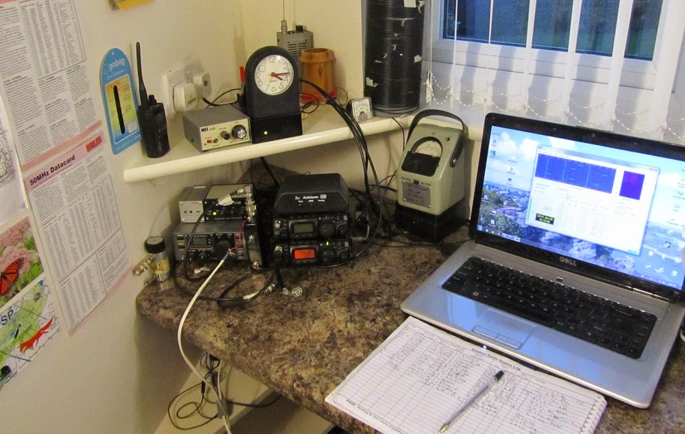 As many of you know, I had a cerebellum brain bleed in Sept 2013 which was operated on. I am steadily recovering, but my voice is still poor so I much restrict operations using voice modes for now. The picture shows the operating position in my shack. As shown, I am using 500mW on 10m WSPR (WSPR-AXE-CW beacon) and 5mW ERP on MF WSPR via a homebrew transverter (just below the clock) and the earth-electrodes in the garden. MF uses the PC and FT817 whereas the 10m beacon is tiny and needs no PC. The loading coil (above the power meter) is not used with the earth-electrodes. It is used when on MF when loading up miscellaneous other antennas. It is not in use at all currently.