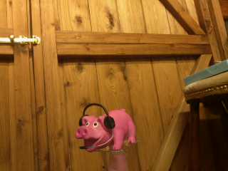 "Pinky" pig will be the passenger on the day, donning his fetching headset. Getting him in the right position for the camera was tricky.