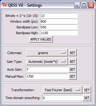 QRSS VD Spectrograph is the program that displays in real-time what you are receiving. It has no obvious user interface – you have to right-click the window and then you will get a menu of options. One option lets you select the sound card that is connected to your radio. Another is for setting the frequency. The main settings option determines the size of the window and the maximum and minimum frequencies that are displayed.